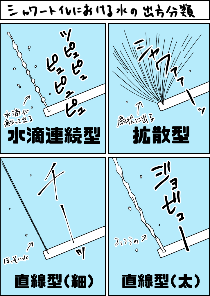 シャワートイレのシャワーの水の出方には、メーカーなどで色んなタイプがあるんだよ。