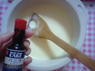 卵黄が固まらない60度くらいに暖めた牛乳と生クリームを卵に混ぜていく。ついでにバニラエッセンスも入れる。