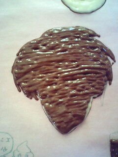 黒いチョコと同じ要領で湯煎し、コルネに詰めたホワイトチョコで白くしたいところを塗る。