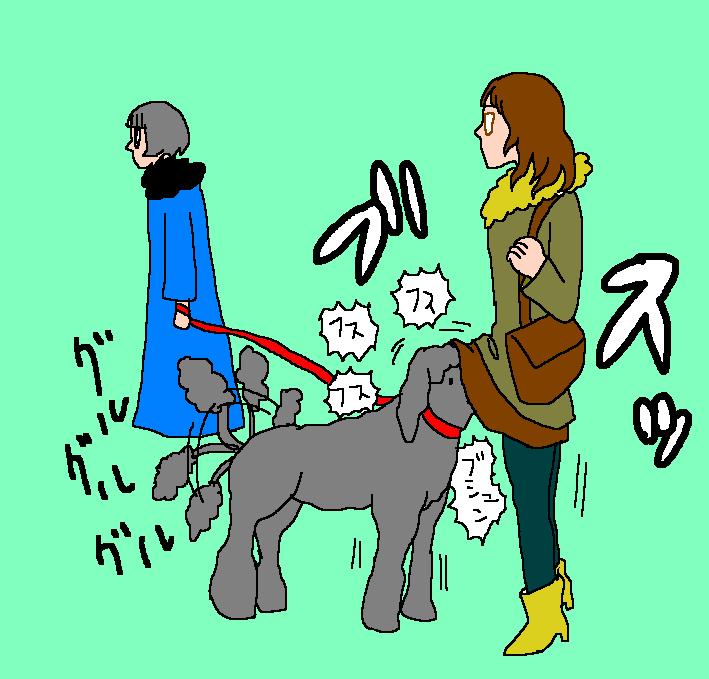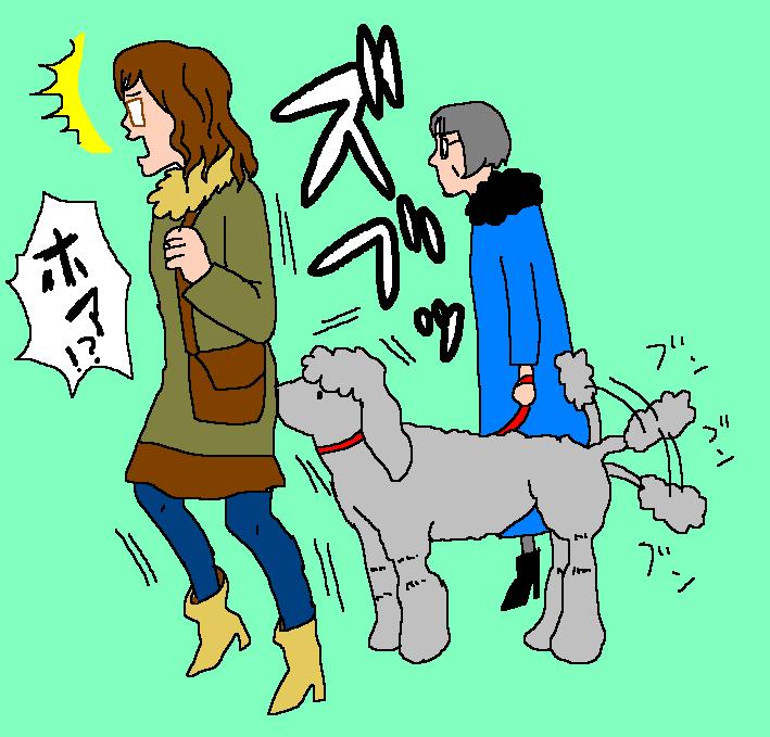 何ならもっと嗅ぐ?つって、犬の粗相に焦る飼い主(初老の婦人)に余裕の微笑返し。