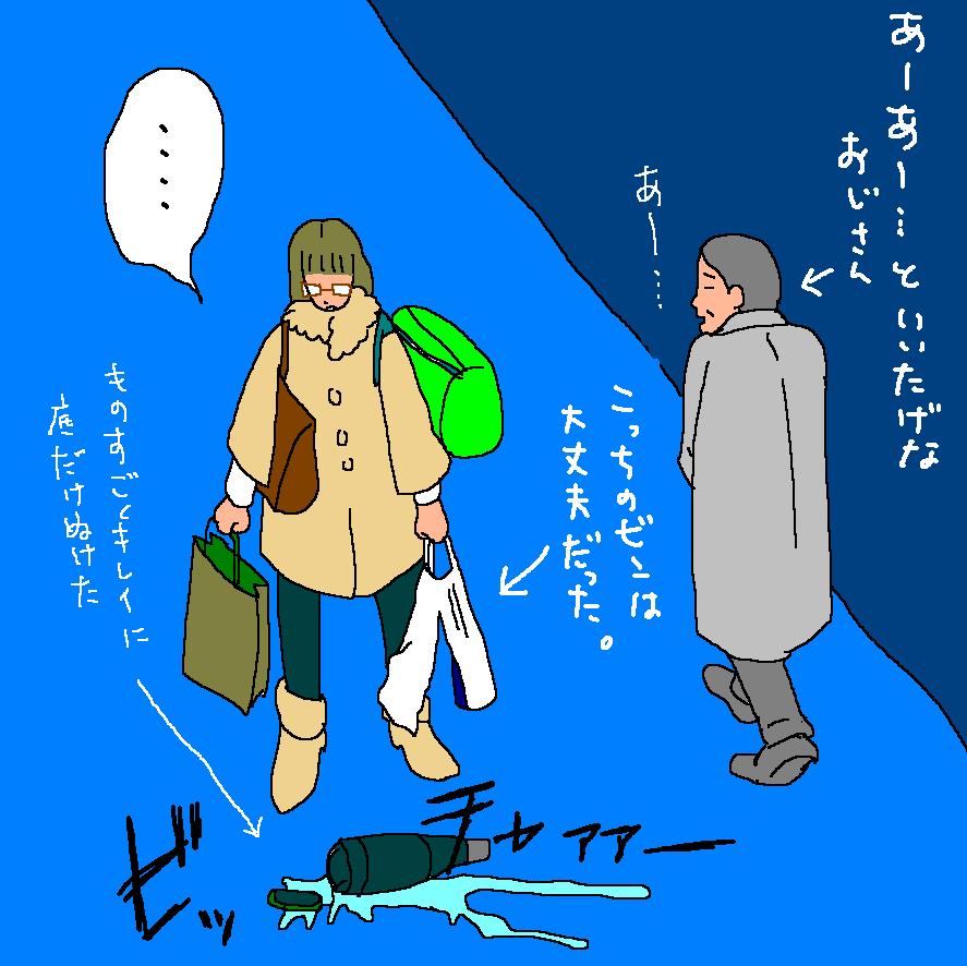 で、割れた瓶をひろおうにも、両肩に糞重いバッグぶら下げて、