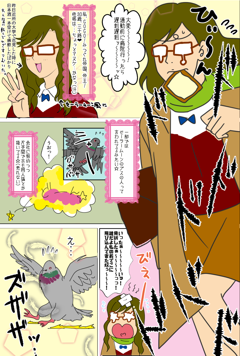 そしたら突然、鳩がデコにぶつかってきて、あまりの突然さと意味のわからなさに