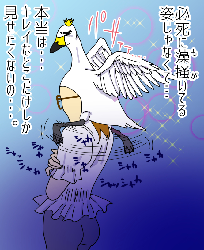 水面下では誰しも必死にバタバタ足動かしてる白鳥なのかもしれんな・・・。