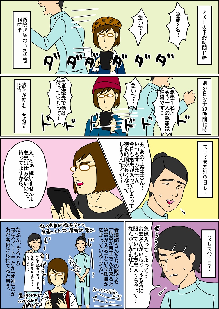 この間も看護師の方に「本当…なぜだか帝王さんが来ると急患が入っちゃって…
