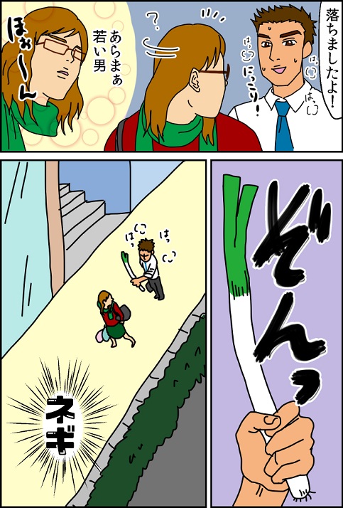落としたのが、ハンカチとかメジャーなものじゃなくてネギとかいうところもなんか